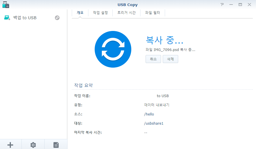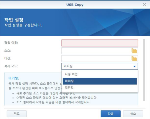복사 모드를 보면 여러 가지가 있는데 나스에 있는 데이터를 그대로 똑같이 유지하길 원하기 때문에 미러링으로 해 주었습니다.