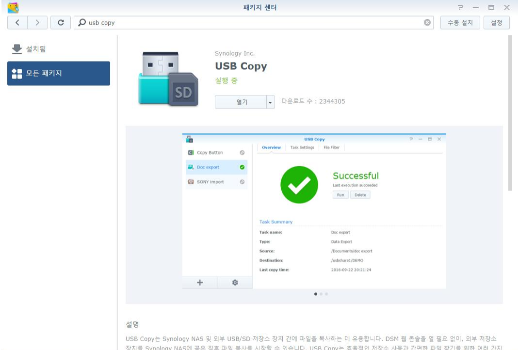 복사가 완료되면 장치 꺼내기를 자동으로 지원해 줍니다. "USB/SD 저장소 장치를 연결할 때마다 데이터 복사"까지 체크가 되어있다면 백업하고 싶을 때 연결해 놓으면 자기가 알아서 백업하고 분리되니 편리할 것 같습니다. 아니면 USB를 계속 연결해 놓은 상태에서 일정을 정해놓고 백업하는 것도 가능합니다.