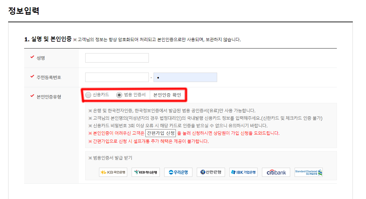 본인인증 관련한 신용카드나 인증서가 필요한데 저는 신용카드를 쓰지 않아서 체크카드로 인증하려고 하니 안되더군요. 그래서 은행 인증서로 하려고하니 또 범용 인증서가 아니라서 안되고...