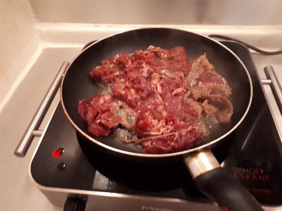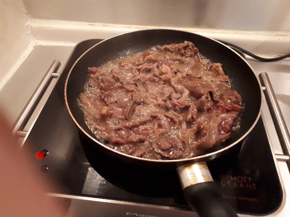 소불고기는 팬에서 익혀주면 됩니다. 그런데 그냥 프라이팬에 익히는 것보다 물을 약간 넣고 수증기로 익히는 것이 간도 적당하고 맛도 더 좋더군요. 물을 넣지 않으면 약간 간이 센 느낌이 들더군요. 아무튼 이것도 우리가 아는 그 소불고기 맛입니다.