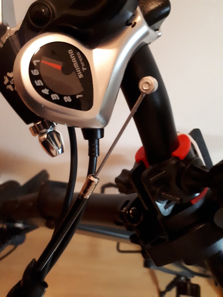 이제 브레이크 쪽에서 너트가 보이는데 풀어줍니다. 너트가 2개가 보이는데 둘다 홈에 있습니다. 그홈을 일직선으로 맞추어 그 사이로 케이블을 빼내야 합니다. 위 사진에서 빨간라인을 따라 일직선으로 맞추어 케이블을 빼냅니다.