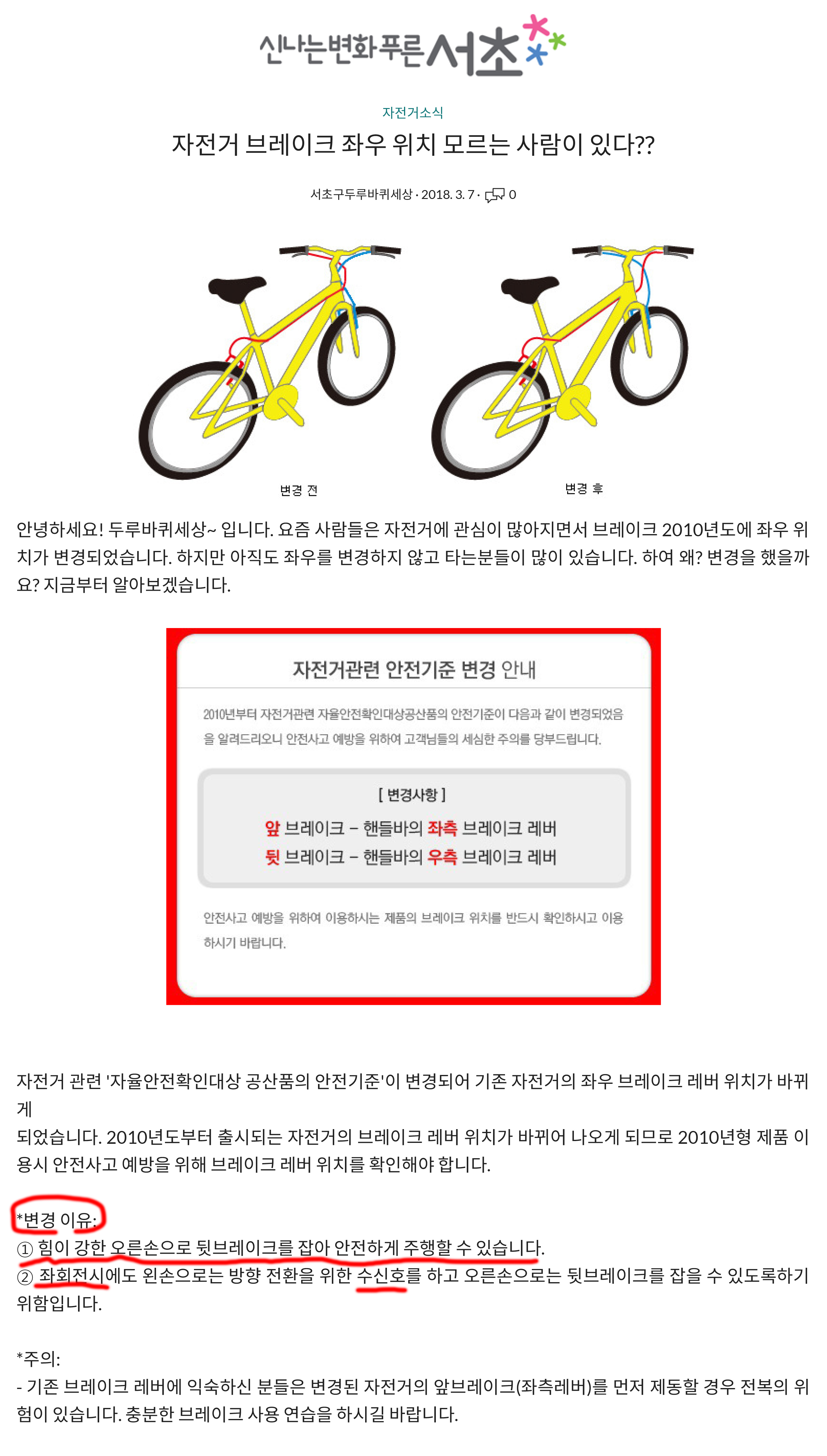변경 이유를 보면 "힘이 강한 오른손으로 뒷브레이크를 잡아 안전하게 주행할 수 있습니다." 라고 적혀있습니다. 왜 오른손이 힘이 더 강하다고 단정 짓는 것일까요. 브레이크를 꽉 잡는다고 해서 제동력이 더 좋아지지는 않습니다 왼손이건 오른손이건 적당한 힘 이상 힘을 주어봤자 의미가 없습니다.