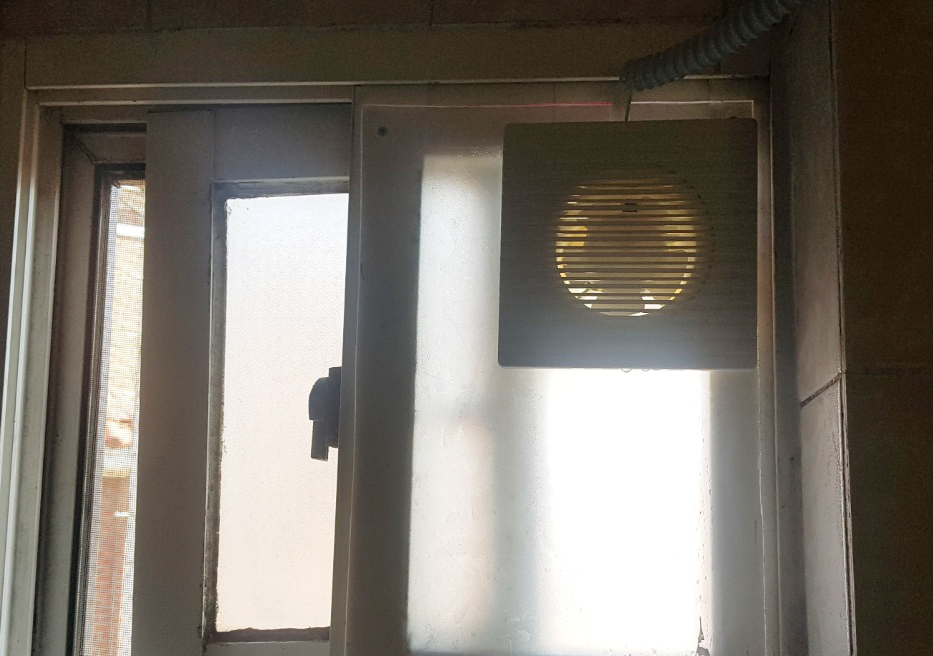 창문을 하나 깨서 버리고 아크릴을 붙이고 그곳에 천장형 환풍기를 설치하였습니다.