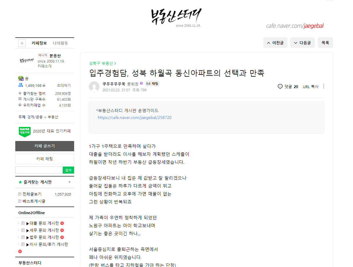제목은 "입주 경험담, 성북 하월곡 동신아파트의 선택과 만족"이라는 제목입니다.