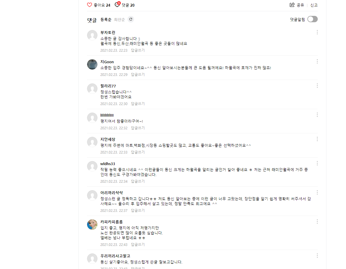 소유주가 쓴 글로 보입니다. 내용을 보면 입지와 호재 등 장점에 대한 이야기입니다. 이렇게 아파트값 상승에 맞물려서 자신의 아파트 가격을 띄우기 좋은 글을 올리면 댓글로 분위기를 맞춰주는 것 같습니다.