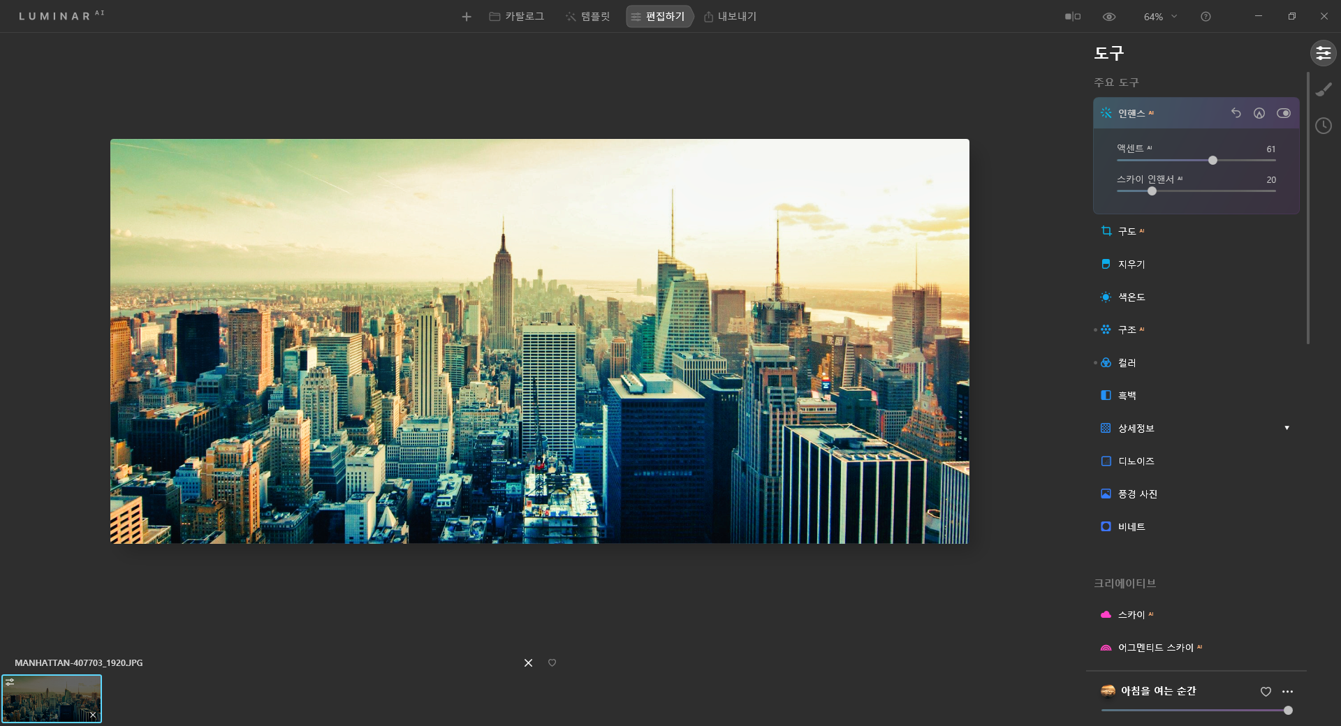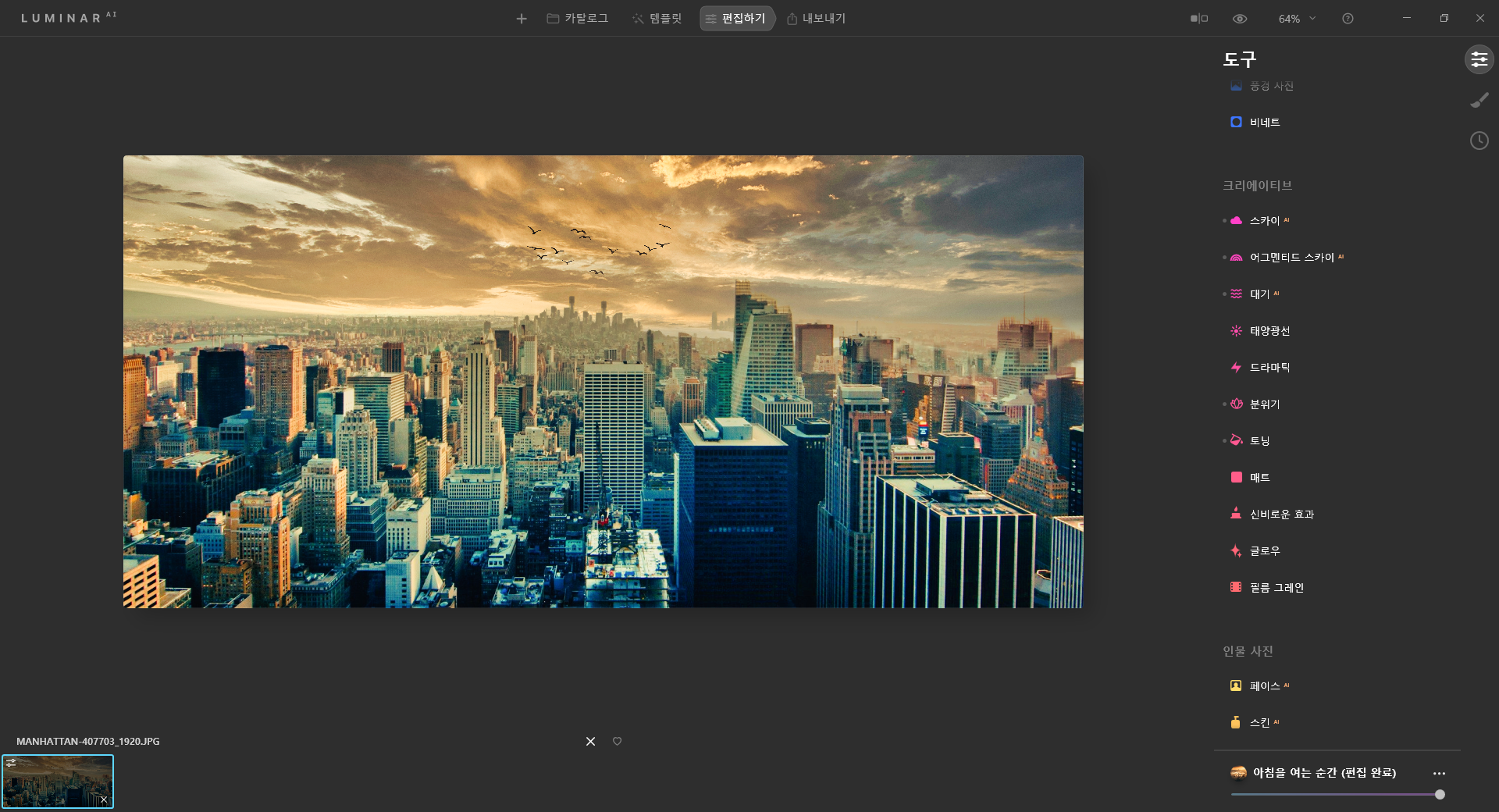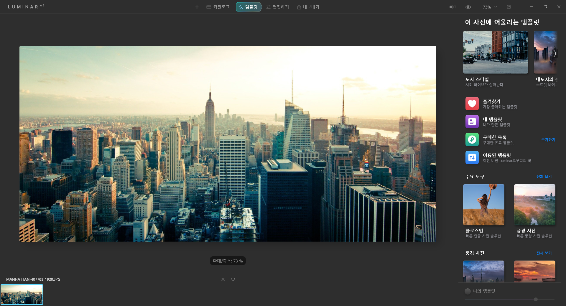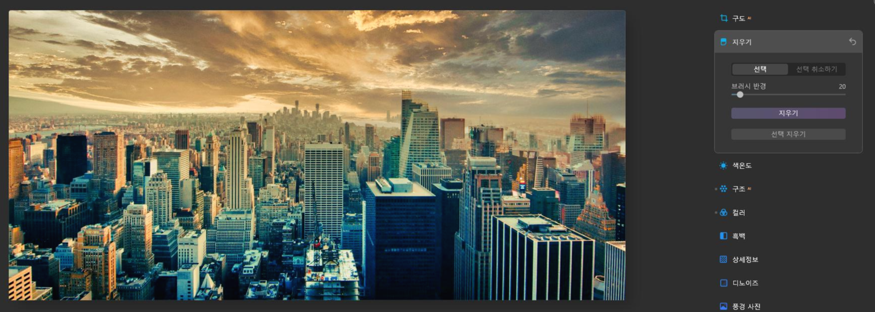 루미나르 Ai는 포토샵의 필터 기능을 더 발전시킨 프로그램 느낌입니다.