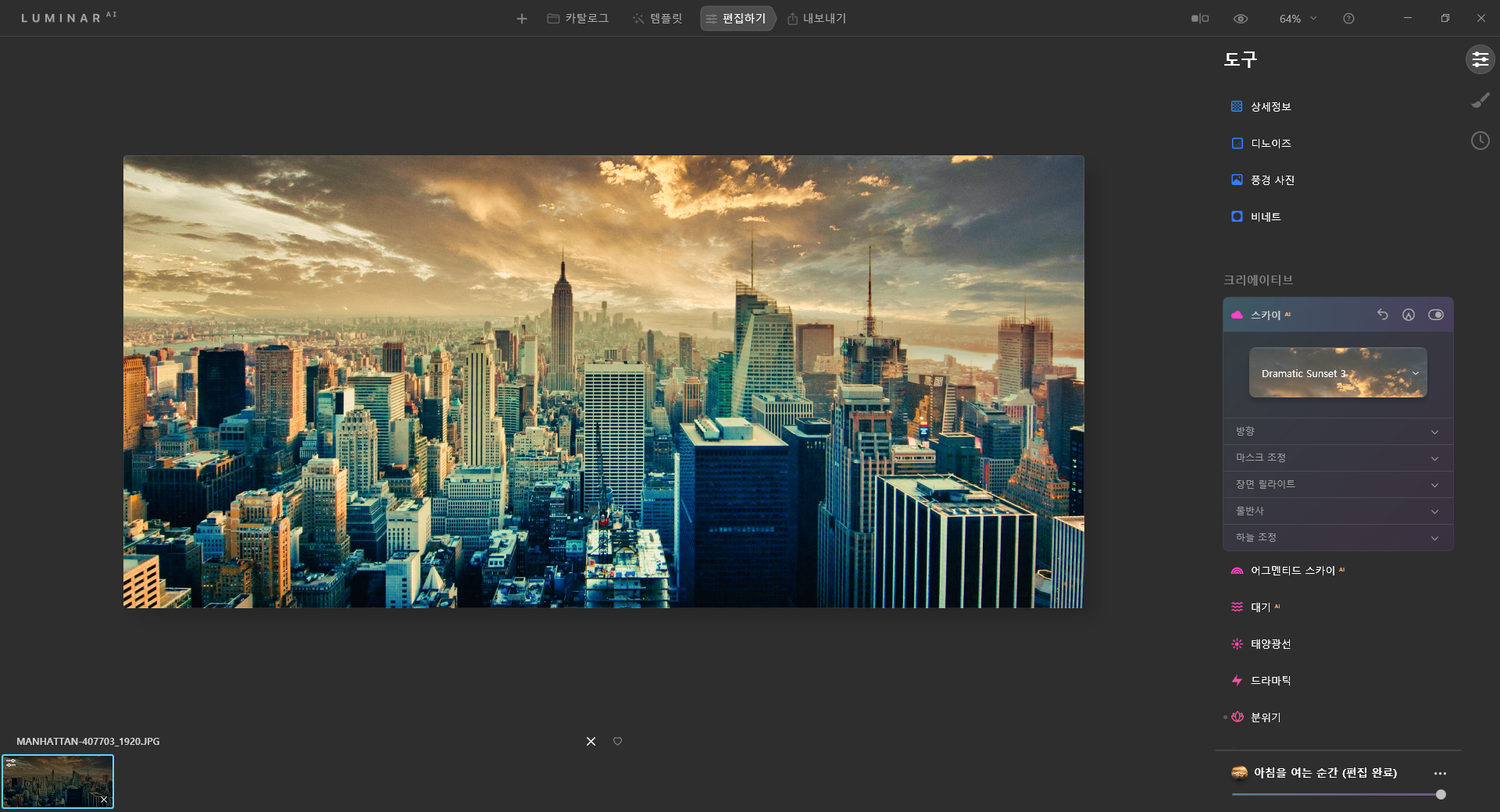 몇 번의 클릭으로 색보정과 독특한 분위기를 만들기 좋은 루미나르 Ai.