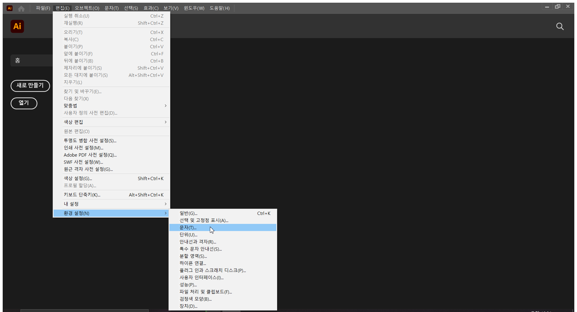 일러스트가 열리면 상단 메뉴에서 편집 > 환경설정 > 문자를 선택합니다.