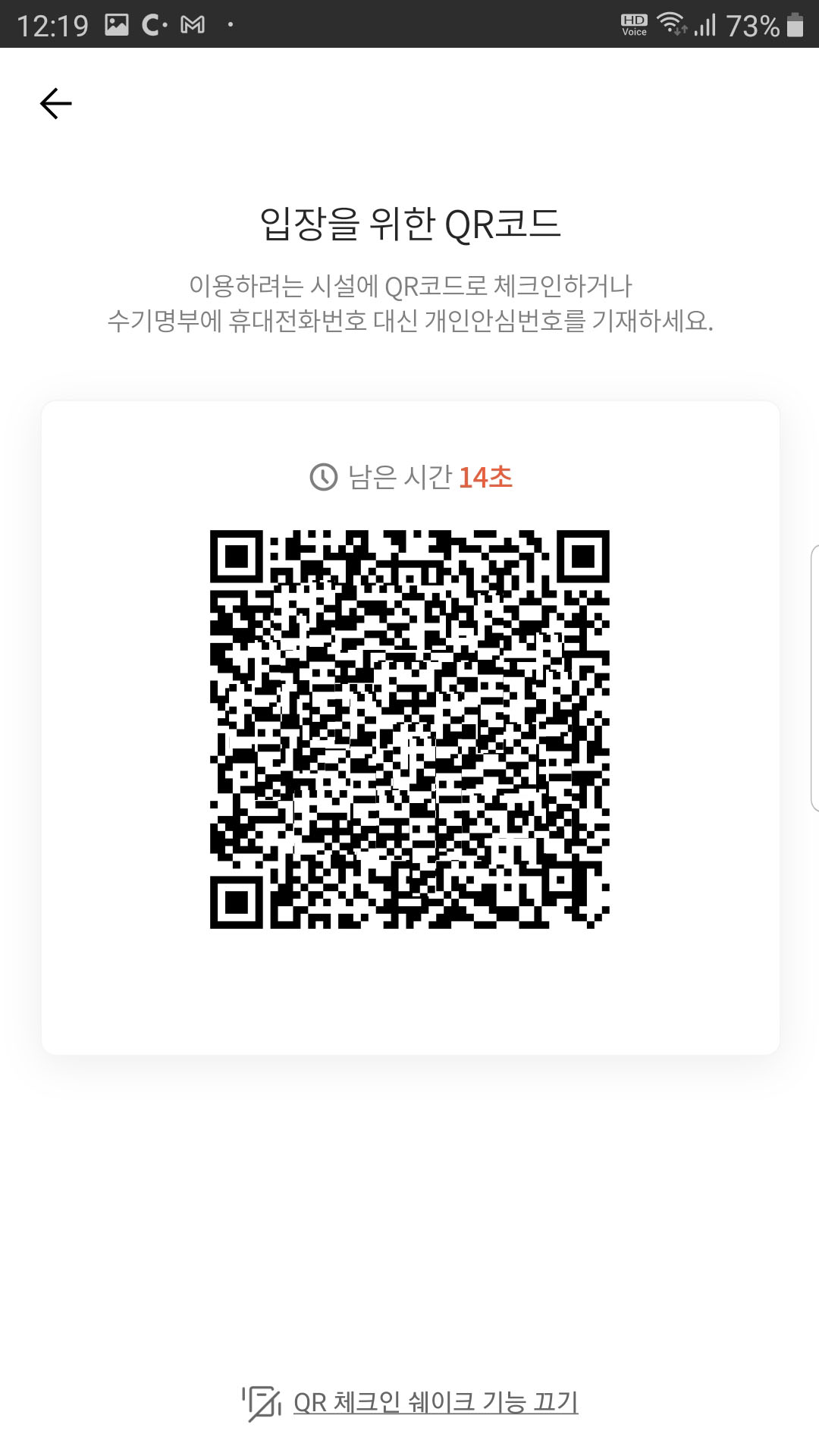 이후 QR 체크인을 할 경우 카카오톡 실행 후 핸드폰을 두 번 흔들어주면 아래와 같이 QR코드가 바로 뜹니다.