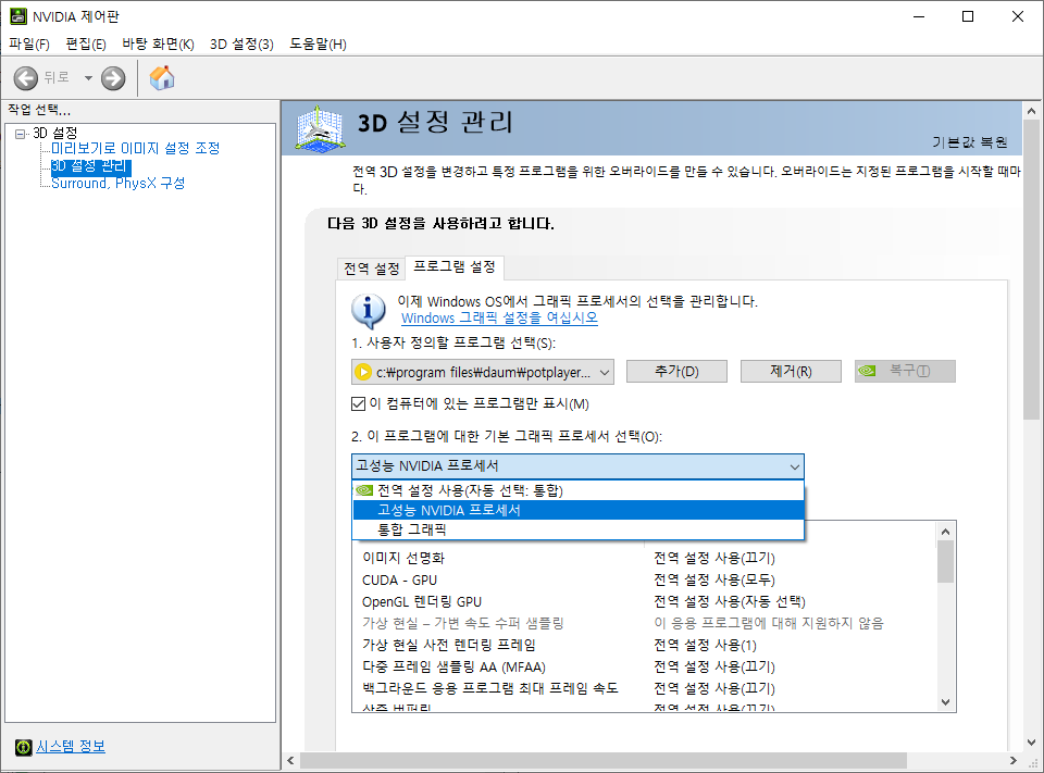 이렇게 설정하고 팟플레이어를 실행시키면 팟플레이어는 외장 그래픽을 이용하여 구동하게 됩니다.