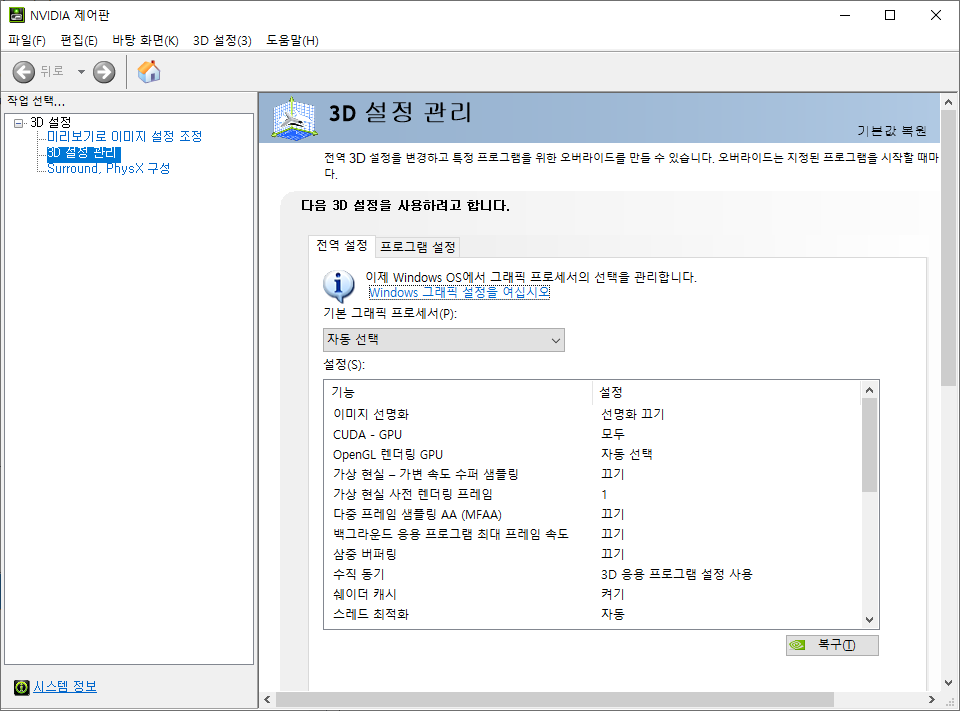 ※아래와 같은 화면이 나오는데 전역 설정이 자동선택일 경우 사용하는 프로그램에 따라서 자동으로 내장 그래픽이나 외장 그래픽을 자동으로 선택하게 됩니다.