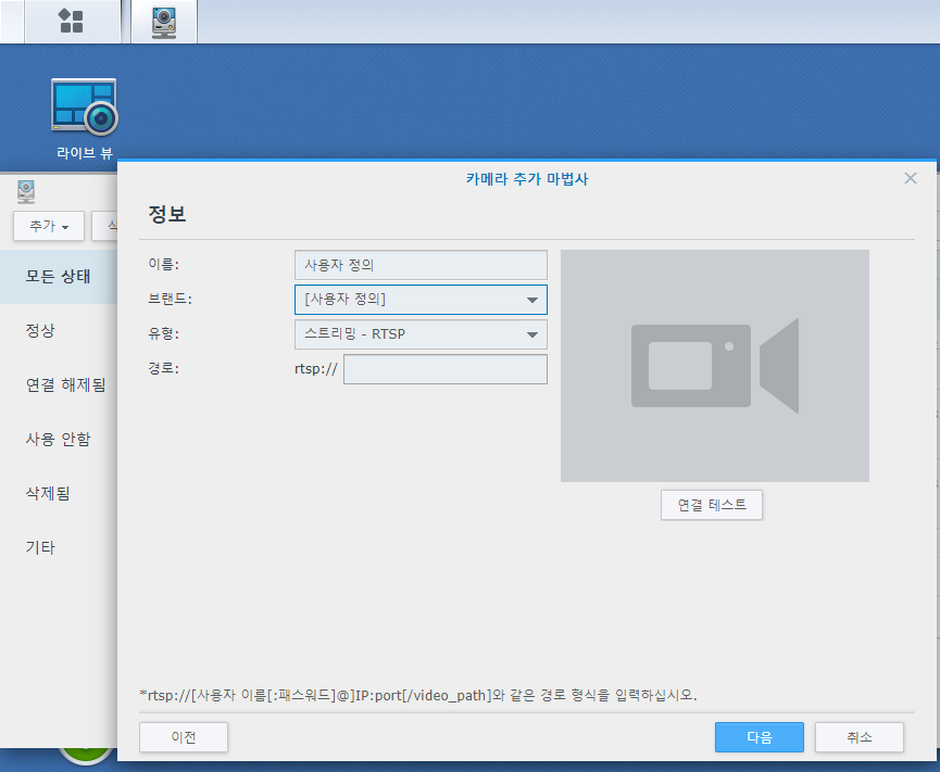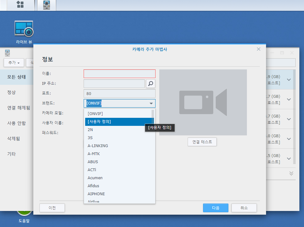설정을 해주고 시놀로지 나스 서베일런스에서 카메라를 추가해줍니다.