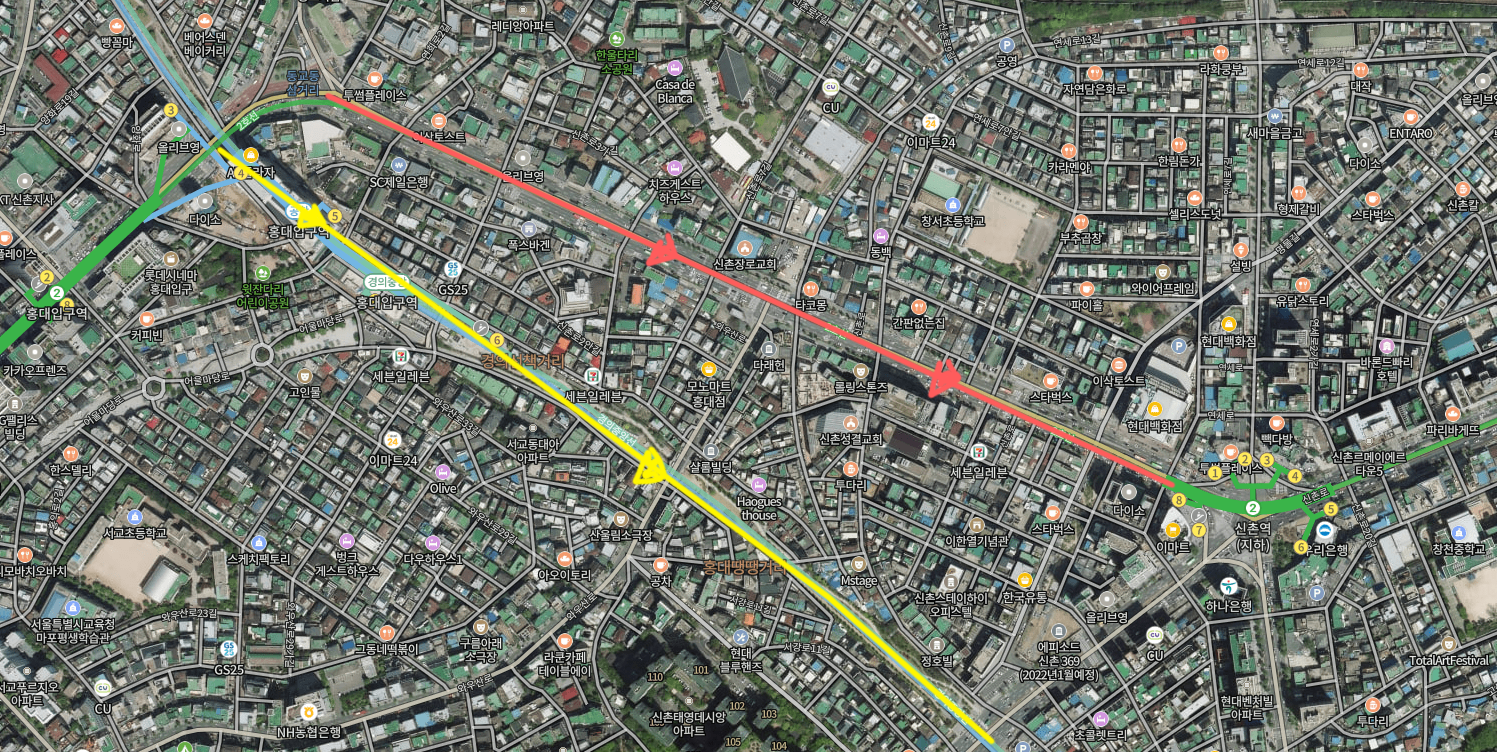 아래 지도는 숲길영향으로 홍대에서 신촌을 잇는 길에서 기존에 붉은색 이동경로에서 노란색으로 이동경로가 바뀌기도 하였습니다. 걸어서 간다면 편안한 공원길을 택하는 게 당연한 것 같습니다.