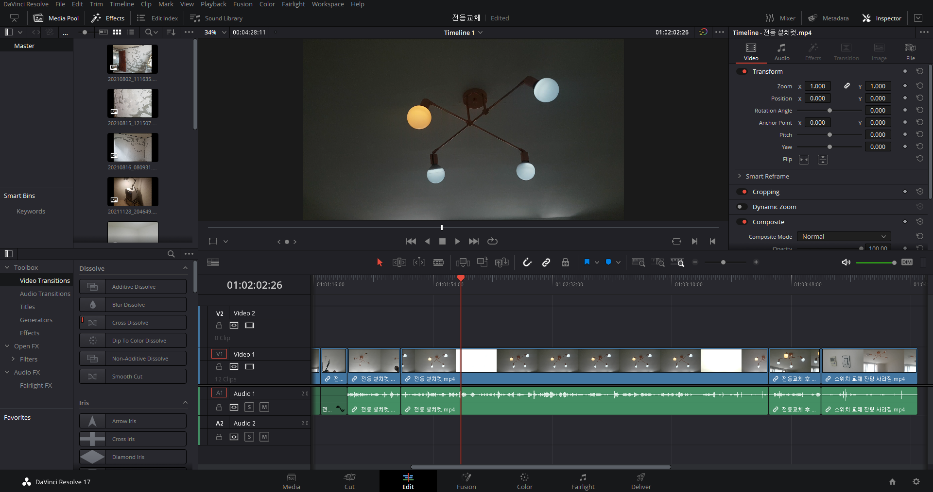 컷 편집은 거기서 거기고 나중에 모션을 배울 때 퓨전 탭을 이용하면 될 것이니까요.