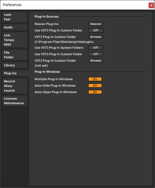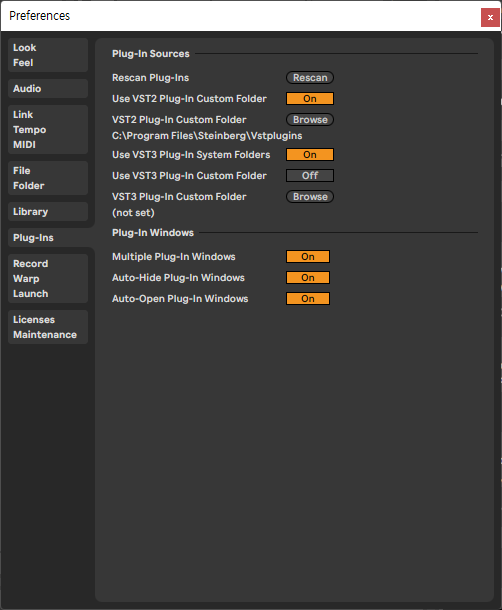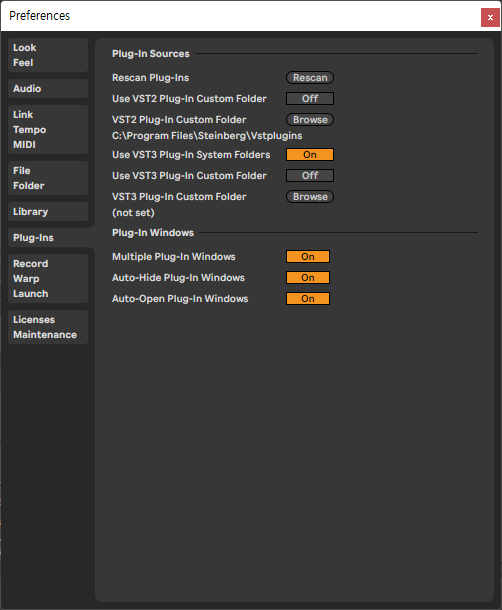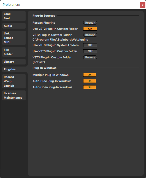 아래 화면에서 Use VST2 Plug-in Custom Folder를 체크하면 On으로 바뀌고 아래의 메뉴에서 커스텀 폴더를 지정해 주면 플러그인이 표시되며 사용할 수 있게 됩니다.