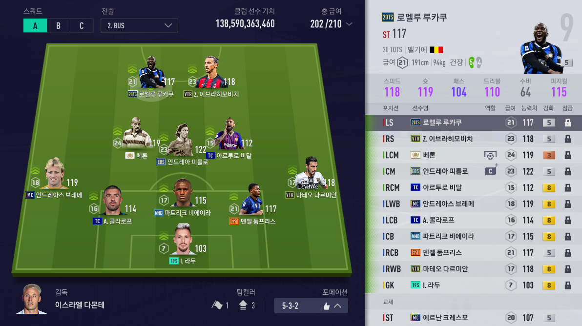 콘 바조를 300억 정도에 넘기고 400억 넘게 주고산 EBS 피를로를 영입하고 5212에서 532로 포메이션을 변경하게 되었는데 수비는 더 탄탄하고 피를로와 함께 후방에서 빌드업하는 재미가 있어서 만족도 가 높습니다.