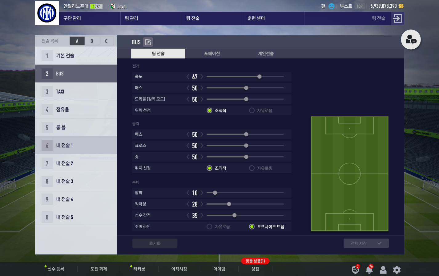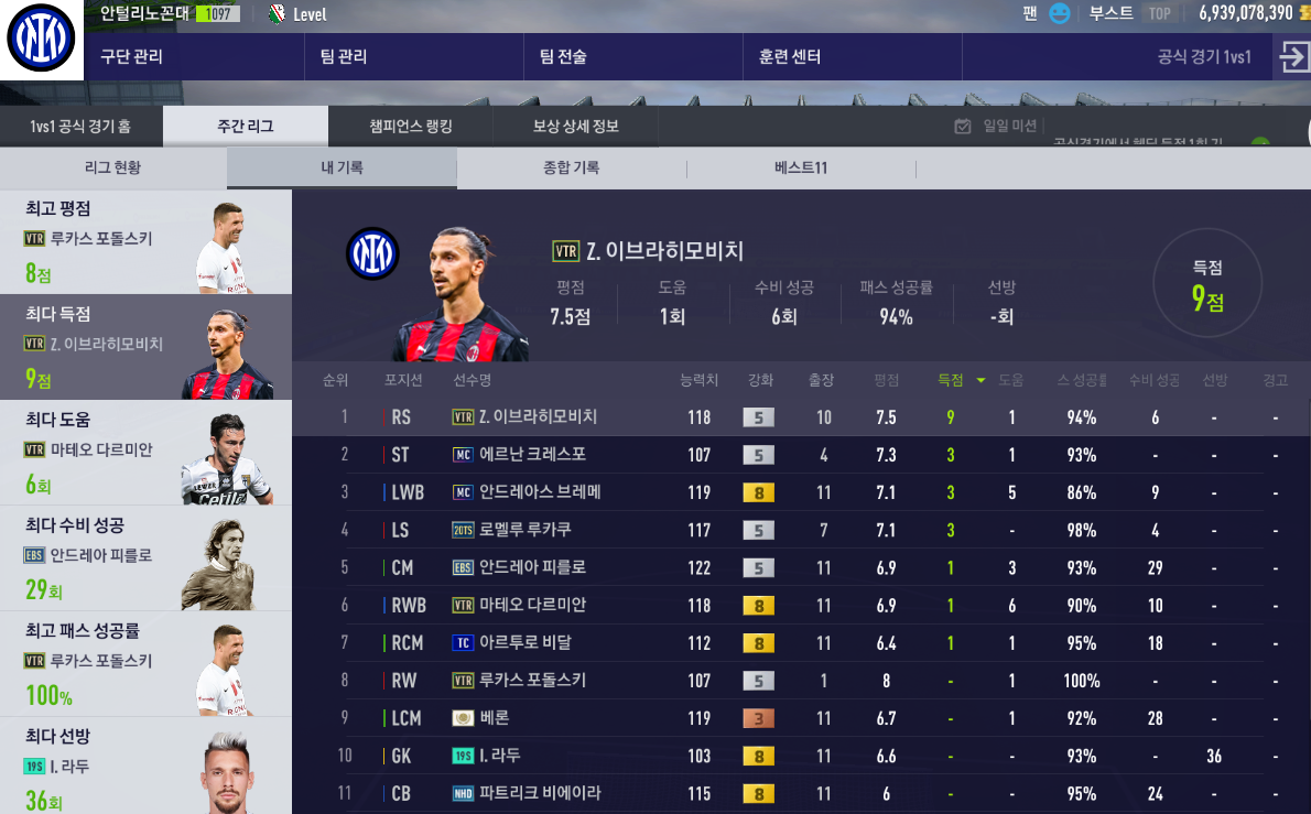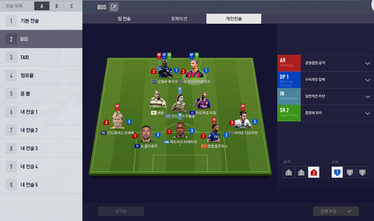 즐라탄은 균형 잡힌 공격으로 해 두었는데 타게터처럼 움직이다가 때로는 침투를 해주는 플레이가 나와서 타게터로 설정하는 것보다 좋은 것 같습니다.