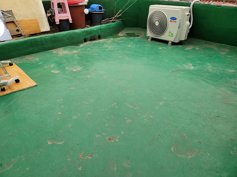 옥상에 우레탄 방수가 되어있다면 그것이 최종 방수층입니다. 그러니 초록색이나 회색 등 방수코팅이 벗겨지거나 찢어졌다면 방수를 재 시공해주어야 합니다.
