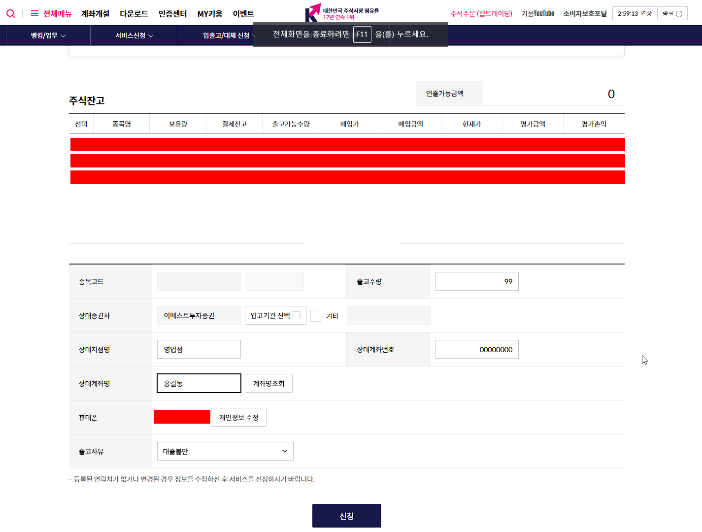 주식 거래 시작 전에 신청을 하니 주식 시장 시작할 때 이미 이전이 되어서 이베스트 증권사를 통해 주식을 거래할 수 있었습니다.
