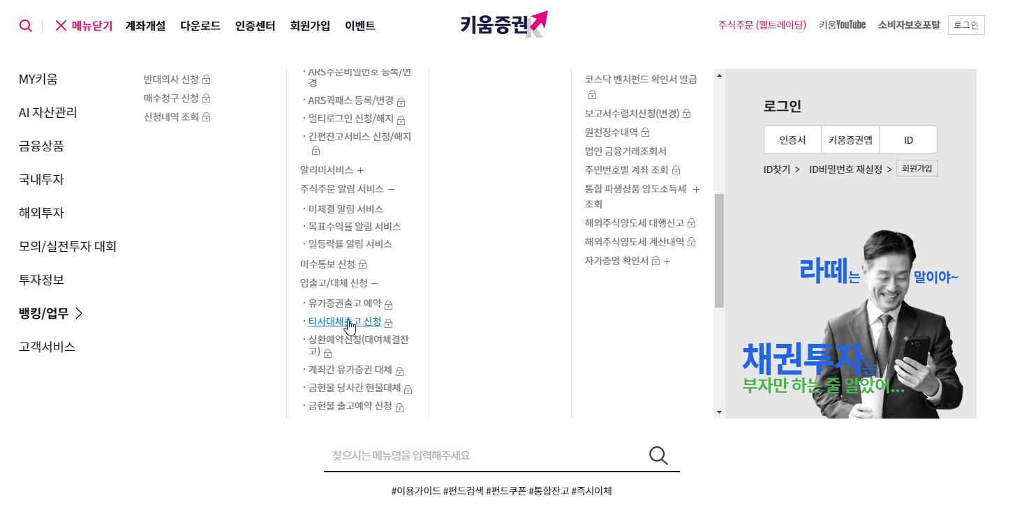 전체 메뉴에서 > 뱅킹/업무 > 입출고/대체 신청 > 타사대체 출고 신청