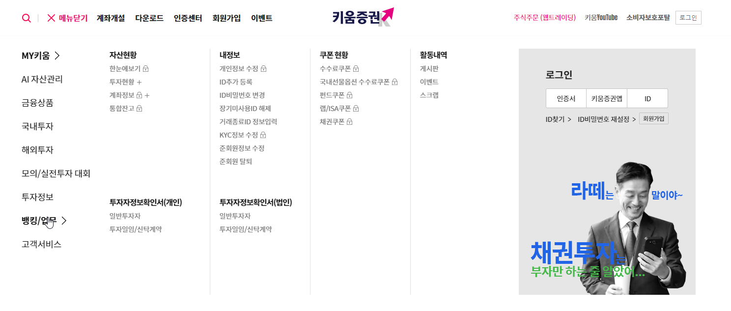 옮기는 방법은 키움증권 홈페이지에 공인인증서를 통해 로그인 한 뒤