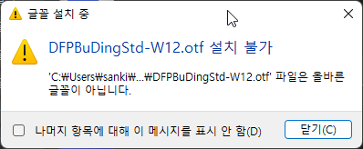 이렇게 설치를 하면 좋은 점은 font 폴더에 바로 복사해서 넣으면 무조건 복사가 돼서 폰트가 제대로 인식이 되는지 여부를 확인할 수 없지만 위와 같은 방법으로 하면 인식이 안 되는 폰트는 오류 메시지와 함께 복사가 되지 않습니다. 그러니 나중에 확인해서 adobe 폰트 쪽에 따로 설치할 수 있어서 좋습니다.