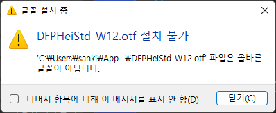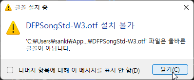 폰트를 설치하는 도중 아래와 같이 4개의 폰트가 설치가 불가능하였습니다.