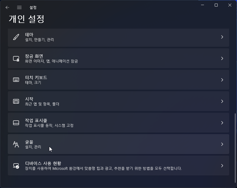 메뉴가 나오면 개인 설정에서 글꼴을 클릭해 줍니다.