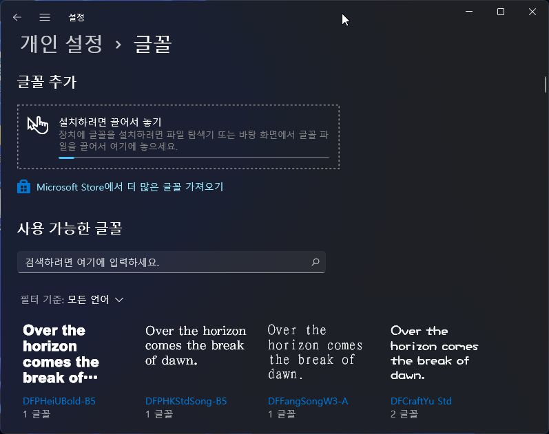 추가하고 싶은 글꼴을 드래그 드롭으로 끌어다 놓으면 설치가 됩니다.