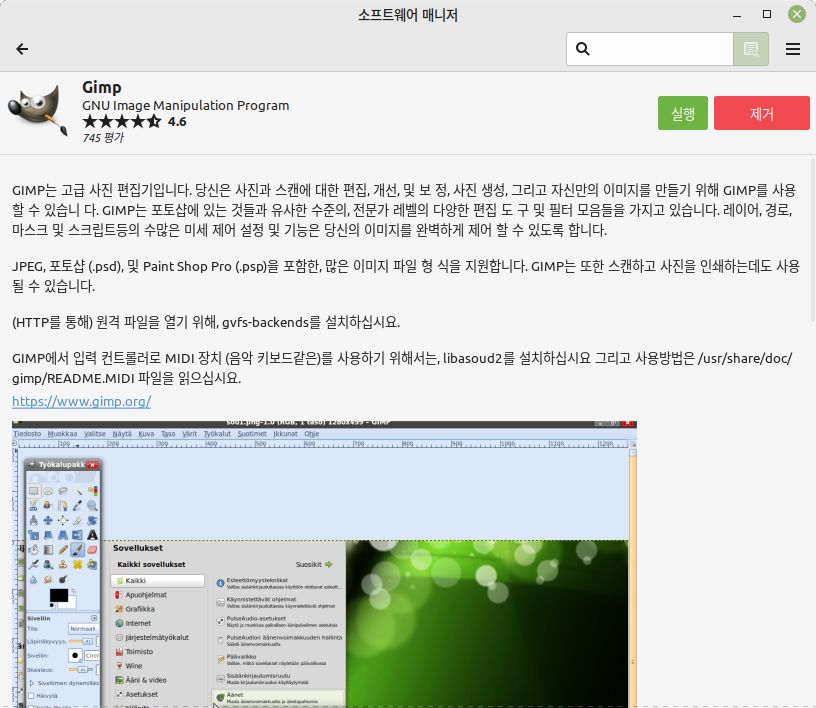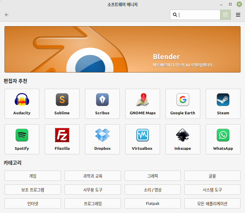 추가로 소프트웨어 매지저를 실행하면 애플 앱스토어처럼 앱을 검색 후 설치할 수 있는 환경이 있습니다.