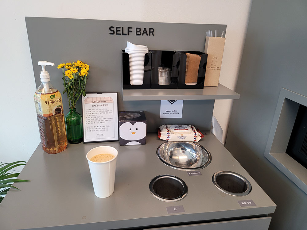 커피를 뽑고 나면 컵홀더를 끼운다거나 시럽 등을 직접 넣거나 할 수 있는 셀프바가 있습니다.