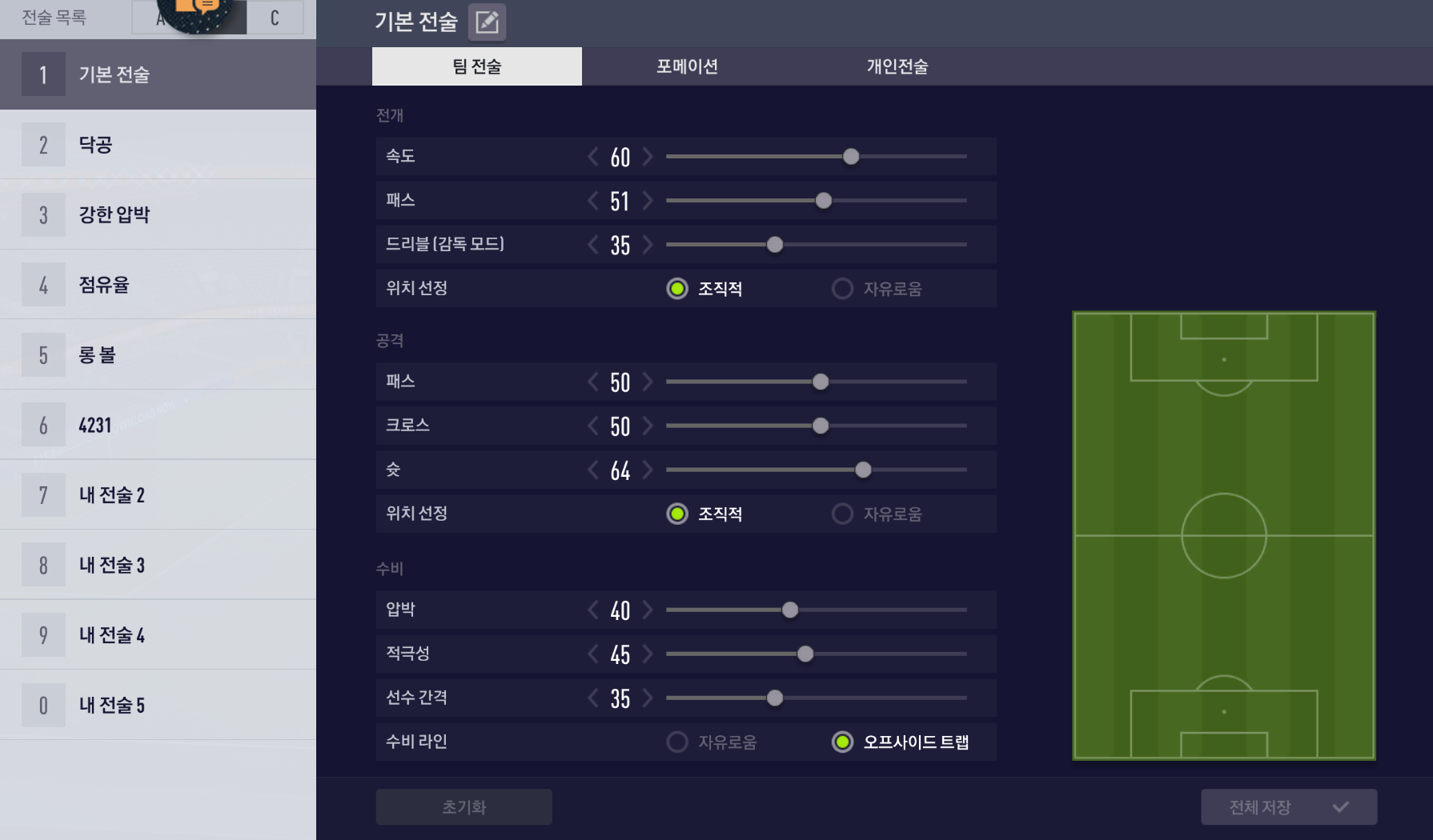 541의 특성상 수비중심정인 포메라 그런지 속도를 좀 올려두어도 공격전개는 빠르게 되지 않습니다.