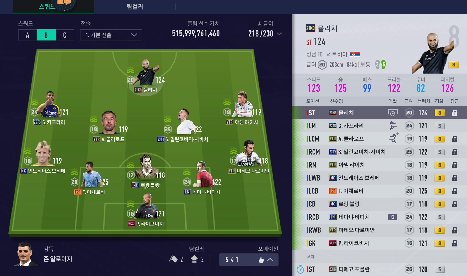 기존인테르 케미에서 뮬리치8카 영입 후 뮬리치 활용을 하기 위한 포메를 찾다가 541 포메에 정착 중입니다.