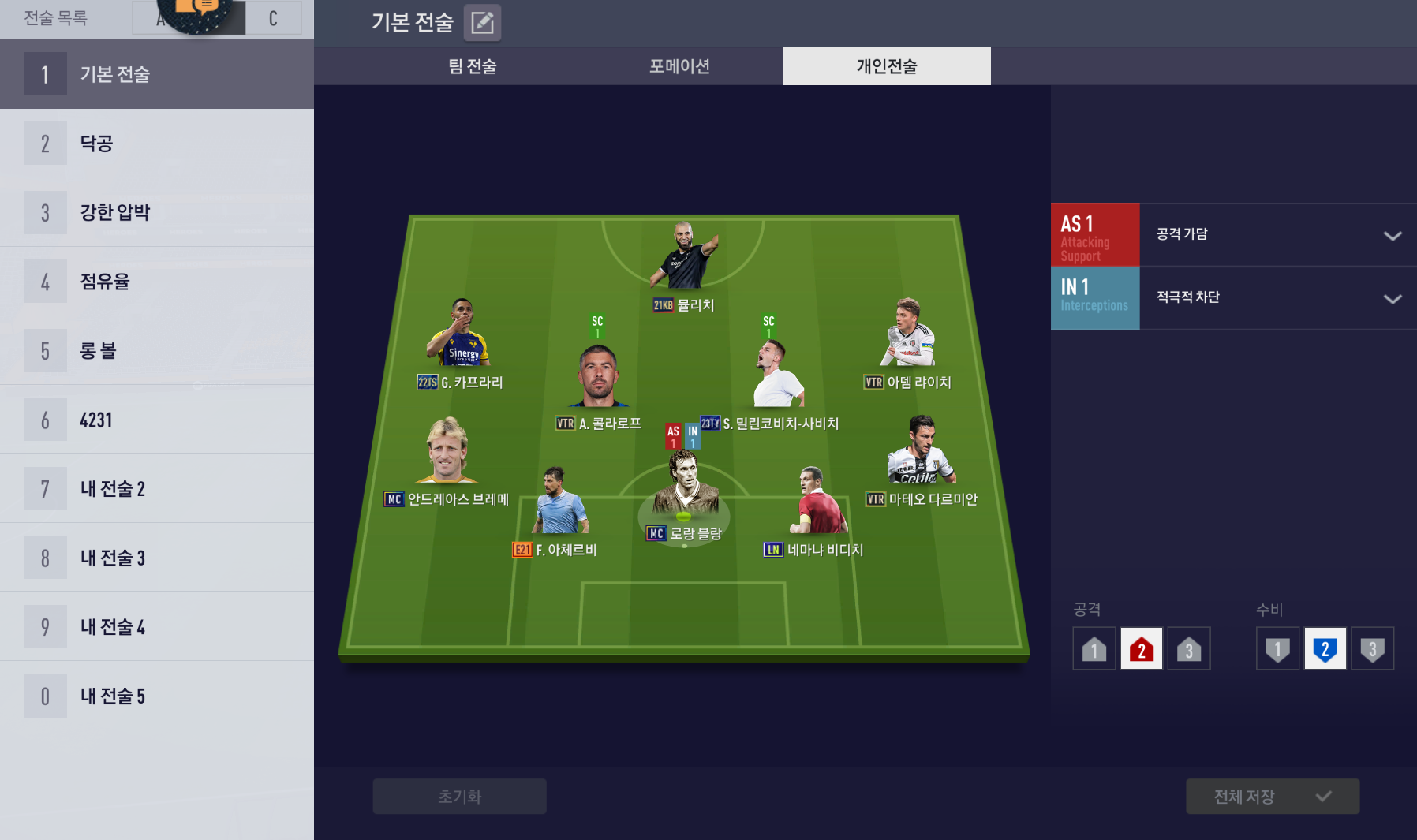 중앙 센백은 훈련코치에 능몸, 재정비, 가로채기를 달아주었는데 가끔 2:1 패스로 전진도 시키는데 재정비가 있어서 수비로 돌아올 때 좋습니다.
